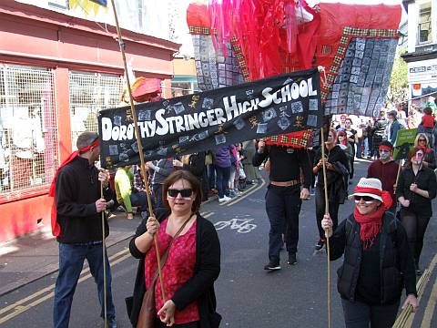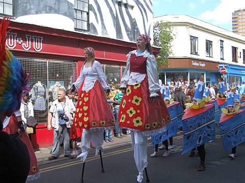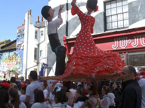Annual carnival parade held on the first Saturday in May, marking the opening of the three week Brighton Festival. The giant parade, organized by community arts group Same-Sky, starts at 10:30 from Pelham Street, and winds it's way through the narrow lanes, to the sea front. Crowds of 10,000+ line the streets to see the Samba bands, towering tableaux, and 5000 costumed participants with drums and whistles. Pictures 03 May 2014. 2014 Video