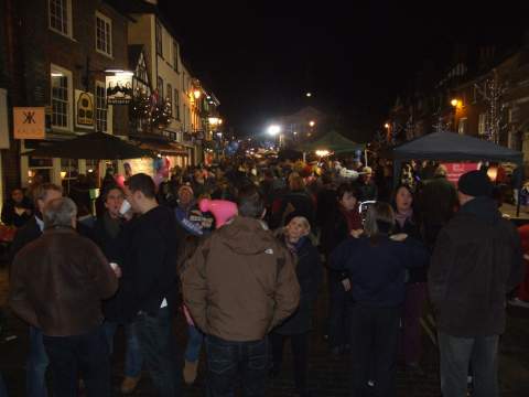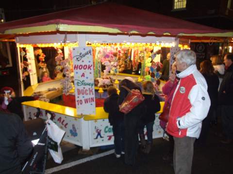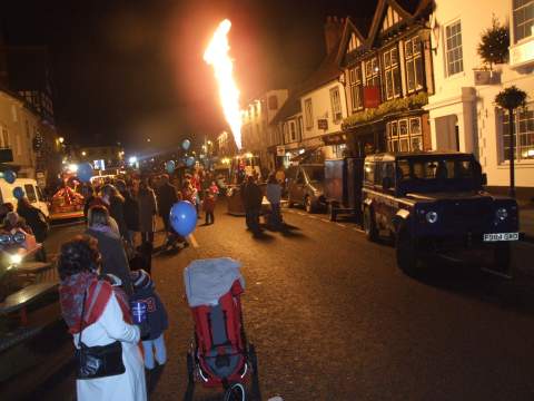 The switching-on of the Christmas Lights in Henley is an annual event held on a Friday, late in November. 17:30-21:00 town centre. Stalls, children's rides, carol singing around the tree, Santa in his grotto and the switching on of the lights at 19:00 on the large Christmas tree in Market Place. Tel 01491 576982. enquiries@henleytowncouncil.gov.uk. Pictures taken Friday 28 Nov, 2008. More [external link] www.henleytowncouncil.gov.uk
